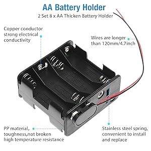 The QTEATAK2Set is an 8 x AA battery holder designed for DIY enthusiasts and professionals alike. Featuring a robust stainless steel spring for easy installation and replacement, this holder is made from tough materials to ensure longevity. With a standard I-type wired connector, itβs perfect for a wide range of applications, from toys to electronic devices, making it an essential tool for any tech-savvy individual.