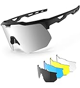 HAAYOT Polarized Cycling Glasses feature 5 replaceable UV-protection lenses designed for diverse lighting conditions, ultra-light TR90 frames weighing only 0.07 pounds, and UV400 protection with polarized black lenses to reduce glare. Soft adjustable nose pads maximize comfort, making these multifunctional sunglasses ideal for cycling, running, baseball, and other outdoor sports.