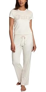 Juicy Couture Women's Velvet Fleece Lounge Pajama Pants combine plush velvet fleece with rhinestone accents for a stylish yet ultra-comfortable fit. Designed with an elastic waistband and stretch fabric, these pants offer versatile wear from cozy nights in to casual outings, complete with practical side pockets. Officially licensed and crafted in the USA, they embody the iconic LA casual glamour that Juicy Couture is known for.