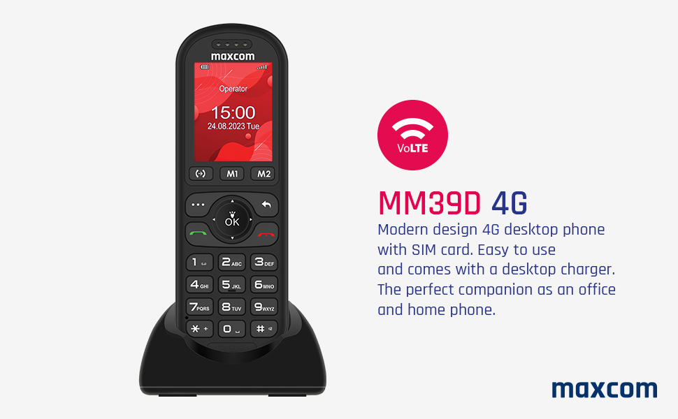 The Maxcom MM39D is a cutting-edge 4G VoLTE cordless mobile desk phone designed for both home and office use. With a large 2.0” high-resolution display, user-friendly island keys, and a powerful 1,000 mAh battery, this phone offers a modern alternative to traditional landlines. The included USB-C desktop charger ensures that your phone is always powered up and ready to go, making it the perfect solution for seamless communication.