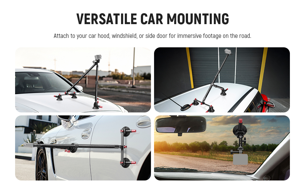 The NEEWER Triple Suction Cup Car Mount Kit features a carbon fiber build with three powerful vacuum suction cups forming a stable triangular mount. It supports up to 2.2lb/1kg and extends up to 24" with telescopic poles. Quick-release NATO rails enable fast setup, and the universal adapter fits top action cameras like GoPro, Insta360, and DJI OSMO, making it an essential tool for professional-grade mobile filming.